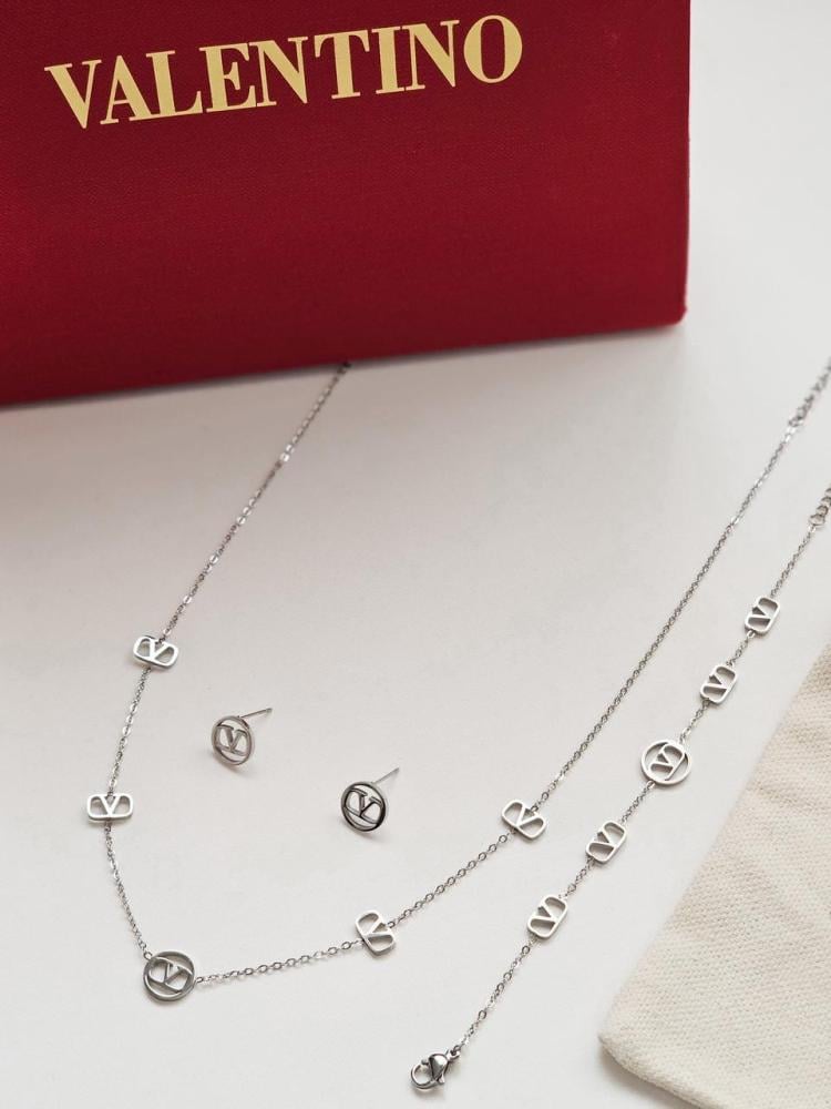 سلسال وأسورة وحلق ماركة فالنتينو فضي مع الملحقات
