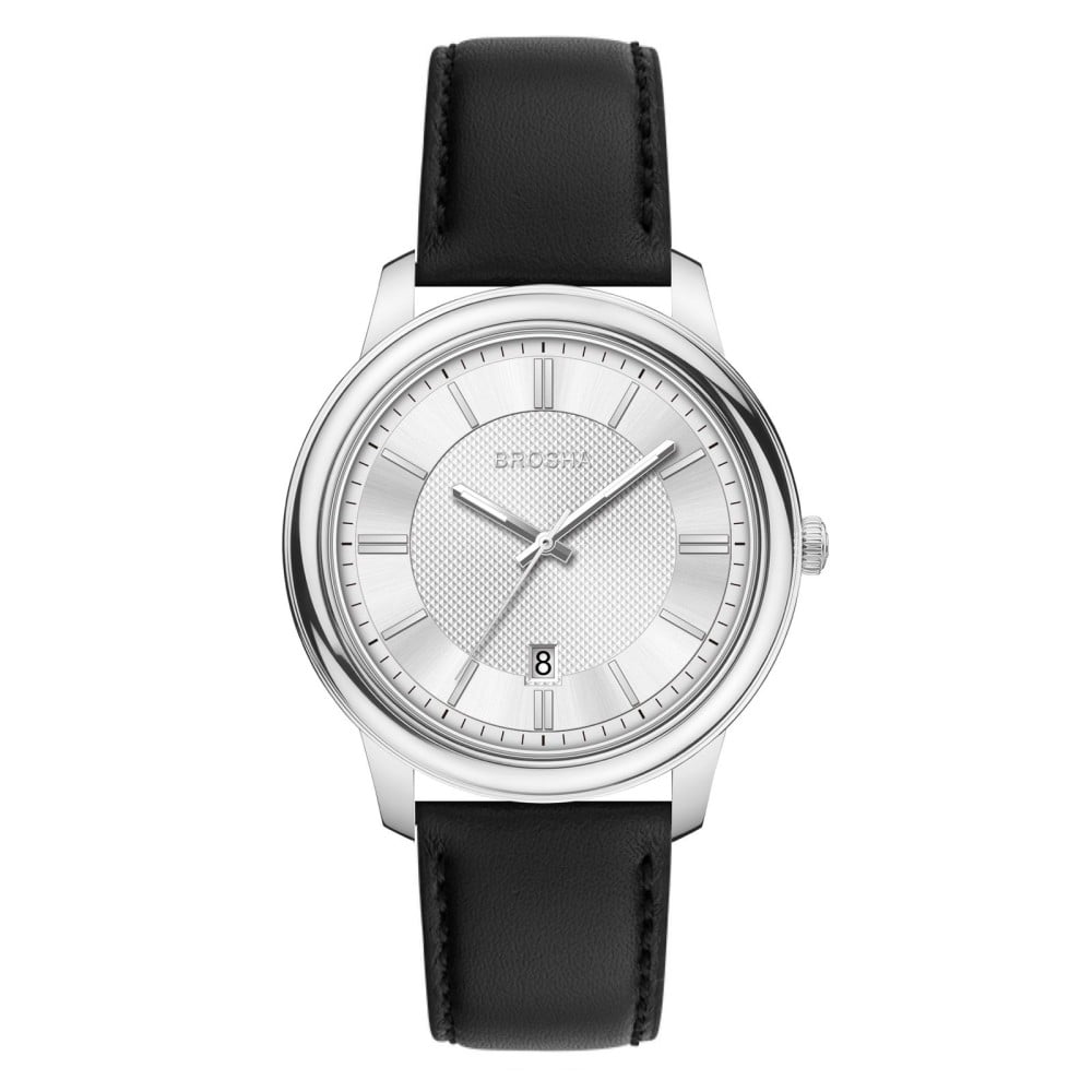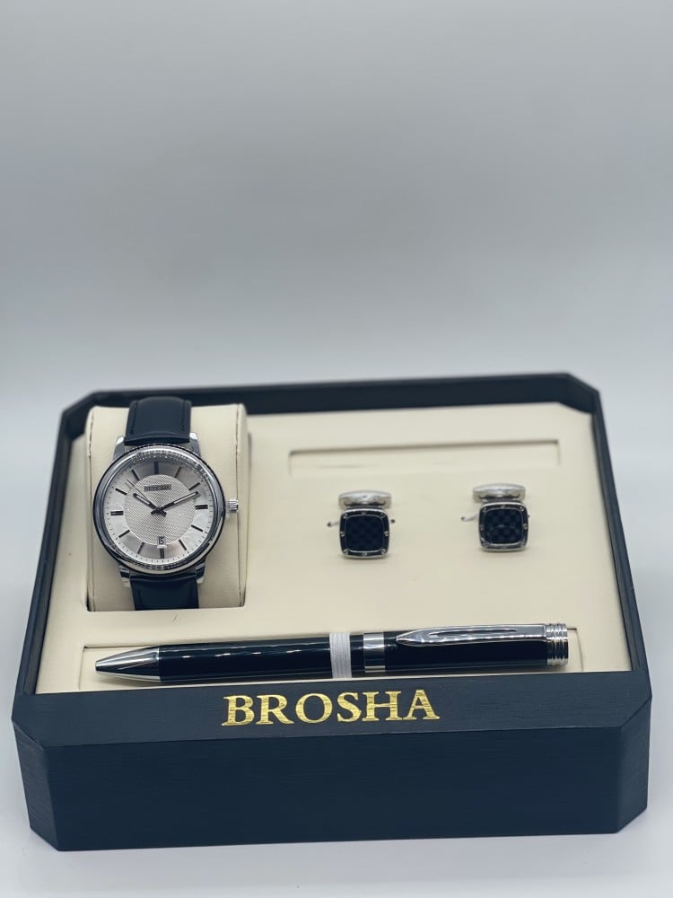 طقم رجالي ماركة بروشا ساعه جلد اسود ميناء ابيض إطار فضي كبك وقلم فضي واسود