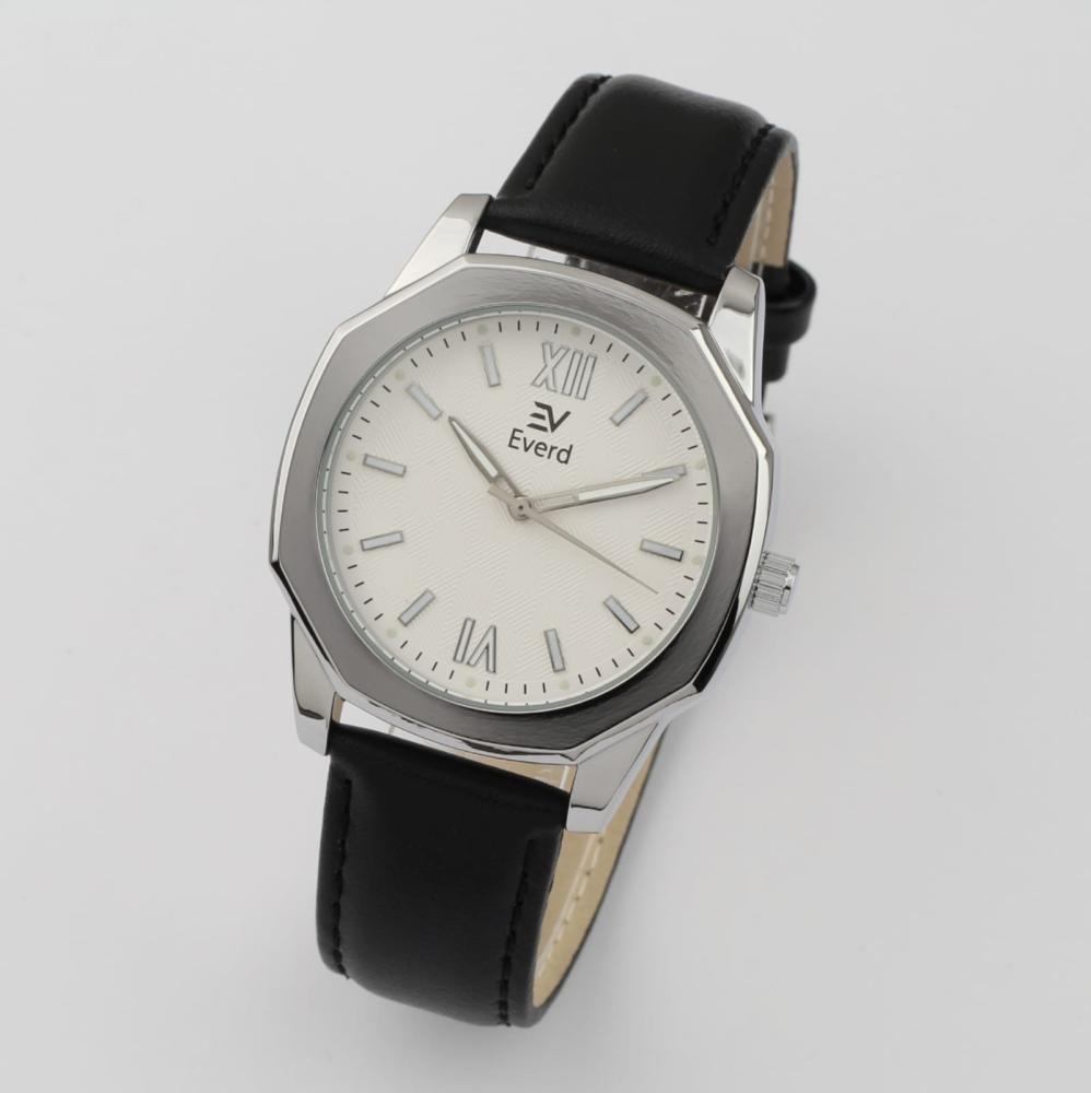 ساعه رجاليه ماركة ايفرد جلد اسود ميناء ابيض إطار فضي