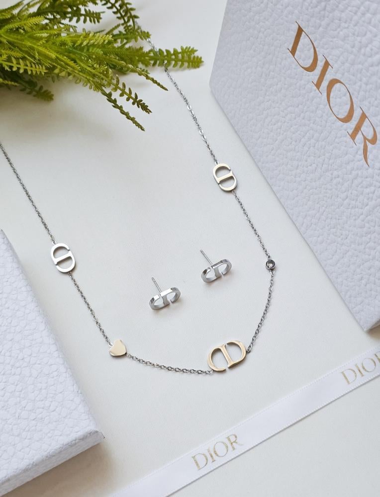سلسال وحلق ماركة ديور فضي مع الملحقات