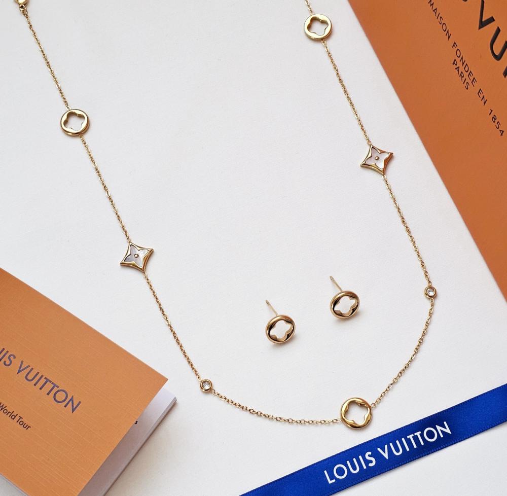 طقم سلسال وحلق ذهبي ورده ابيض ماركة لويس فيتون مع الملحقات
