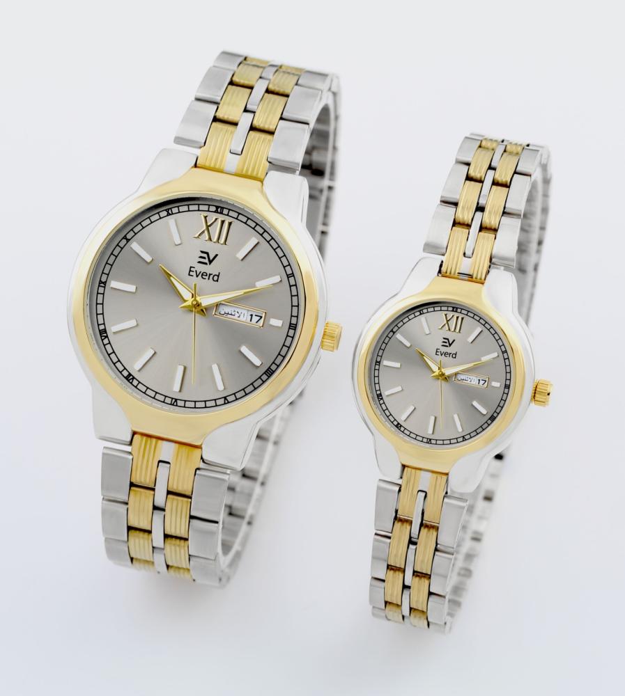 طقم ساعة نسائي ورجالي لون الذي يجمع بين اللونين الذهبي والفضي، ولإكمال الأناقة جاءت بلون مينا رمادي.